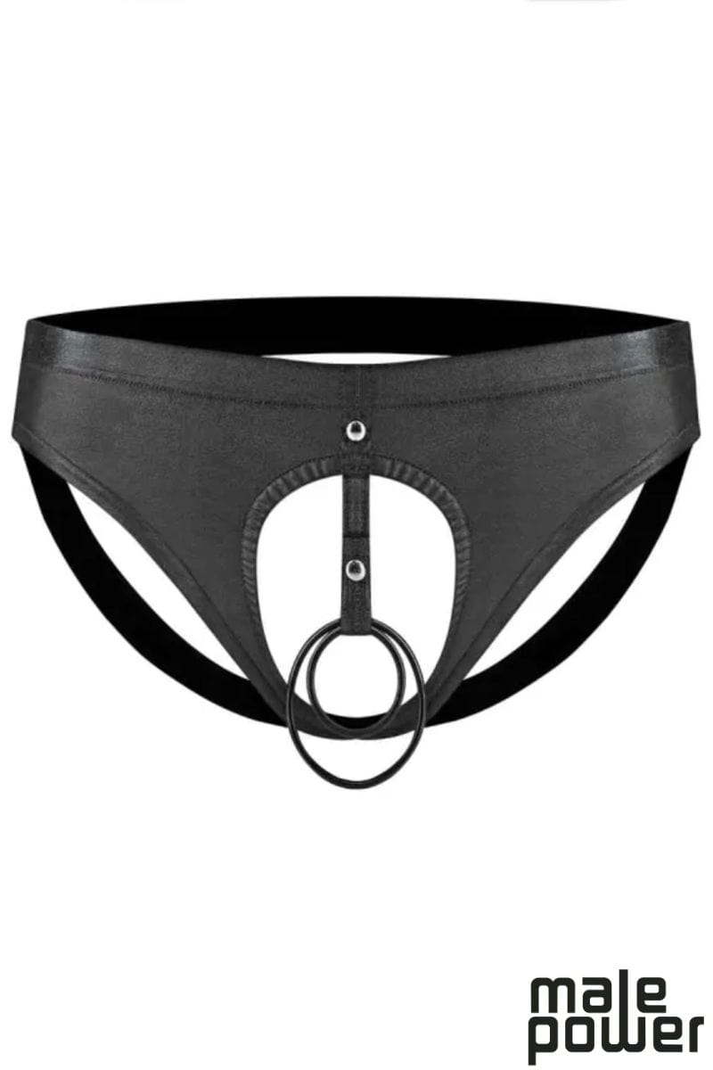 Stretch wet look jock with an open pouch featuring two detachable rubber rings and an exposed rear framed by thick elastics.