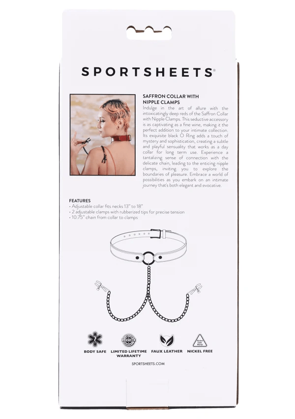 Indulge in the art of allure with the Saffron Collar with Nipple Clamps. Drenched in intoxicating deep red tones and finished with a striking black O-ring, this piece balances elegance, restraint, and playful sensuality in one captivating design.